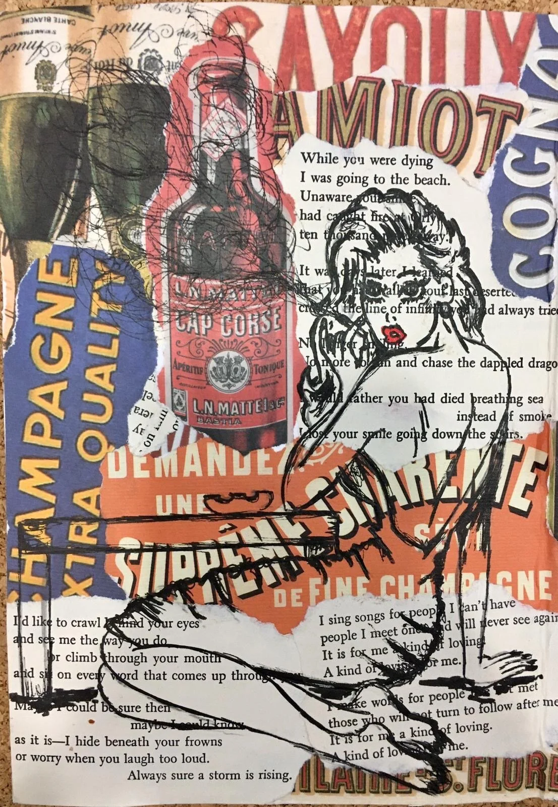 “The illustrations began as a response to a brief given in the first section of the illustration module. It consisted of creating a piece of work that related to any of the series of words provided. The word chosen was “a ghost”. Alexandra wanted to transmit how memories of a relationship can creep up on you, much like ghosts do. She was inspired by the style of 80s comics and their nostalgic, dramatic and romantic look. She used love poems from old books and retro liquor labels to compose the background and add to the vintage feeling. Her intended result was to create the image of a whiskey-soaked, ruined romance.”
