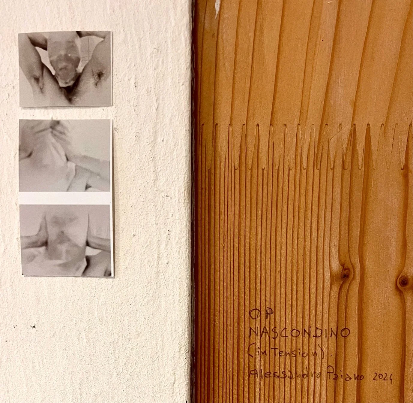 The ID-sized self-portraits in Nascondino (In Tension) feature my head wrapped in wrapping paper, symbolizing the tension between visibility and concealment. This work probes the instinct to hide from external pressures and reflects my exploration of identity in relation to state authority, control, and personal freedom. By employing ID-sized imagery, the piece evokes the physical and metaphorical constraints of identification systems and the bureaucratic oversight that can limit personal agency. Through these portraits, I examine the dynamics of how individuals navigate their identities within structures that often restrict autonomy and demand compliance.