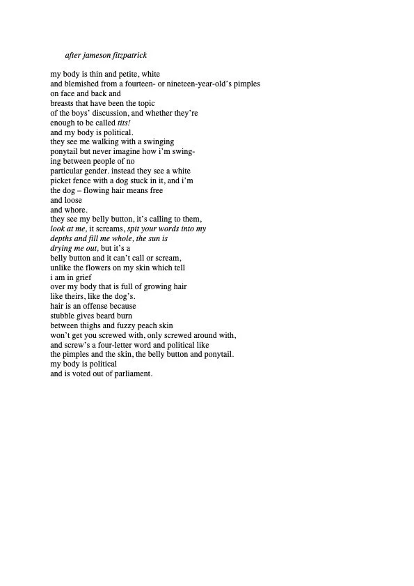 Heather Woodhouse is a third-year Drama and English student at Goldsmiths. Her poetry is predominantly written on public transport, usually in the dark and often in the rain (thanks, England). When she’s not staring tragically out of the window, you’ll find her partying, reading Don DeLillo novels, performing, running late for everything, and also partying…