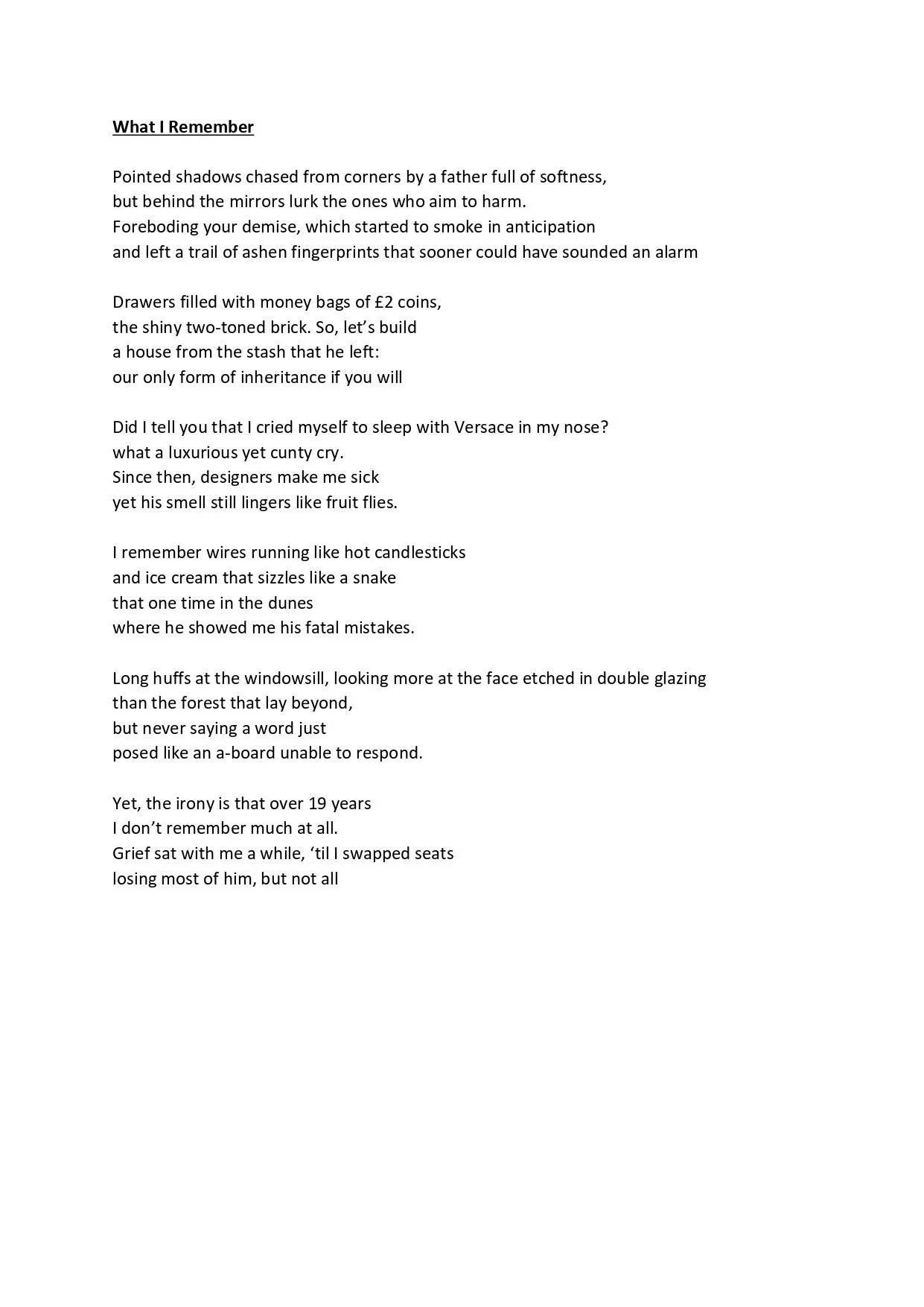 ‘This piece is constructed of memories about my Dad from when I was a child to shortly before his death. After he died, I found it difficult to remember good things about our relationship and so this poem encapsulates a select few of them. Losing someone close to you is a weird event in life as you enter a time-warp of emotions, and the lack thereof, but I wanted to pass on that whilst these memories are painful, they are vital when trying to make sense of grief.’